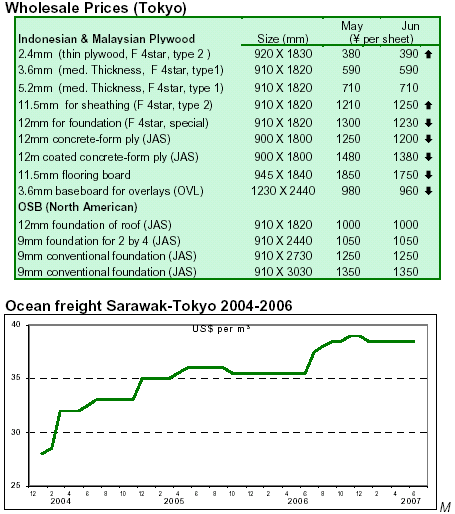 Prices of plywood have not changed since the rainy season started in Japan. Stocks of plywood are still larger than