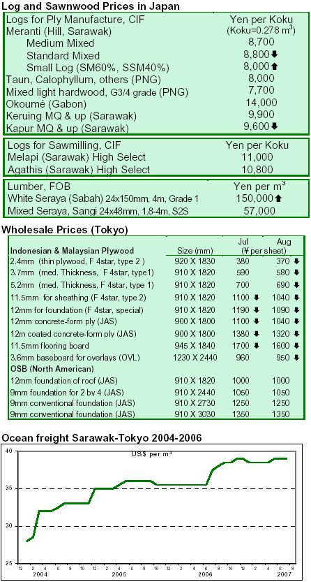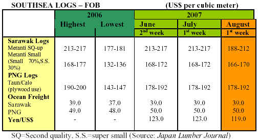 Japan’s imports of Southsea logs in May 2007 were 88,100 m3 and shipments were 98,600 m3. From January to June 2007, imports of Southsea timber products were 242,950 m3. Southsea lumber imports were relatively low in June, since importers were not able to conclude many contracts due to high spot prices.