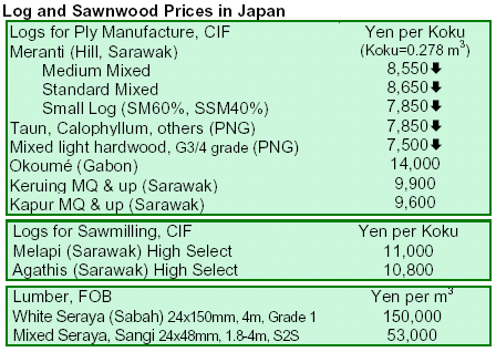 other areas have also reported ample supply. The appreciating yen affected the fall in market prices for logs.