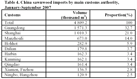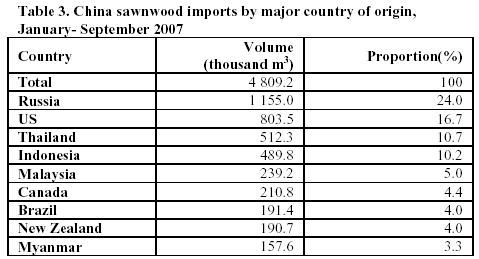 In the first three quarters of 2007 China¡¯s total sawnwood imports were 4.85 million m3 worth