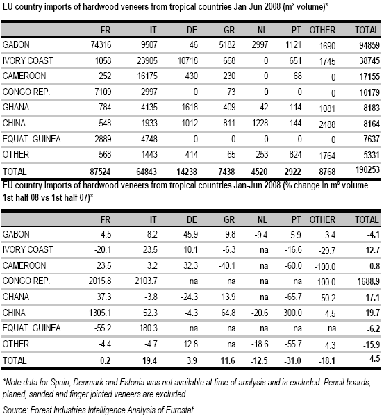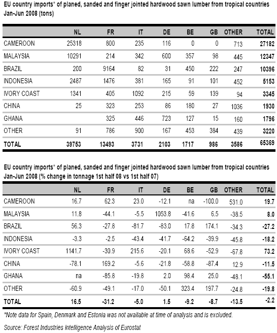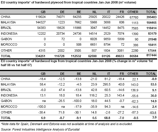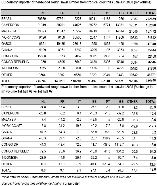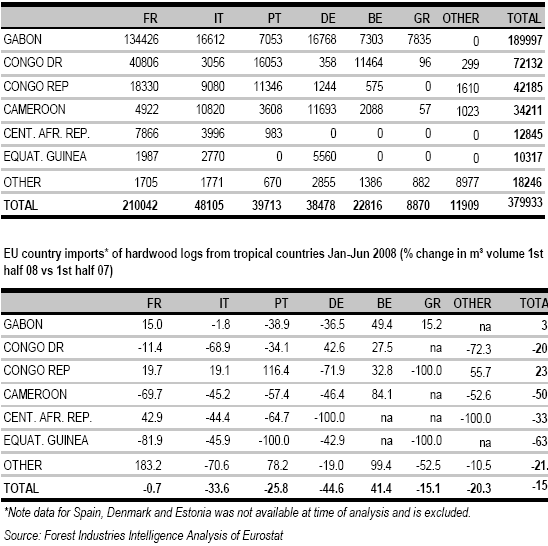 EU country imports* of hardwood logs from tropical countries Jan-Jun 2008