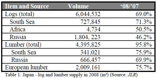 In 2008, Japan’s log imports registered a 31% decline and